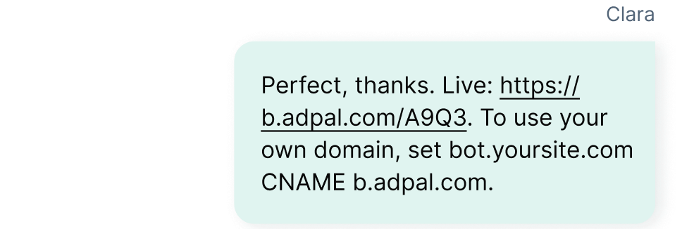 Pick a template, then add your website, docs, or PDFs. AdPal learns your product or service so it answers questions your way.