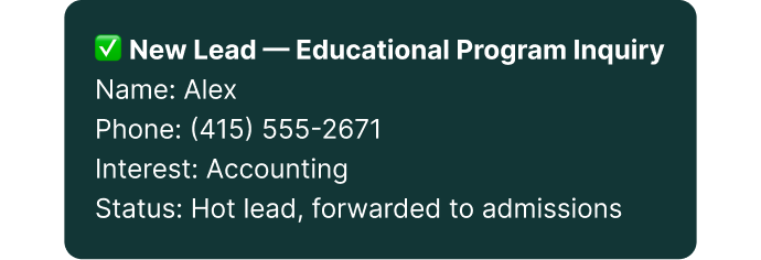 Hot leads are captured immediately, even outside office hours. Students provide their name, phone, and email directly in chat, and Sophie forwards the info to the admissions team for follow-up.