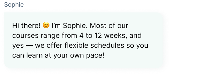 Clara (branded as Sophie for this school) was trained on the school’s website, course catalog, program syllabi, and FAQs from students.