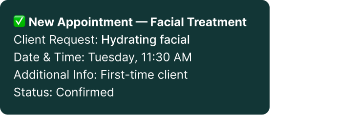 Instead of relying on manual booking and slow responses, a wellness studio deployed our intelligent AI assistant that helps clients book services, answers common questions, and integrates directly with their CRM. Clara ensures every potential customer gets a fast, personalized experience.