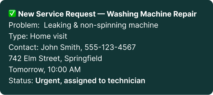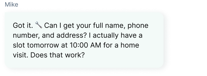 Now, the AI guides clients through the repair process 24/7. 🔧It asks clear questions to understand the problem — whether it’s a leaky faucet, broken appliance, or faulty tool — so the right solution can be offered immediately.